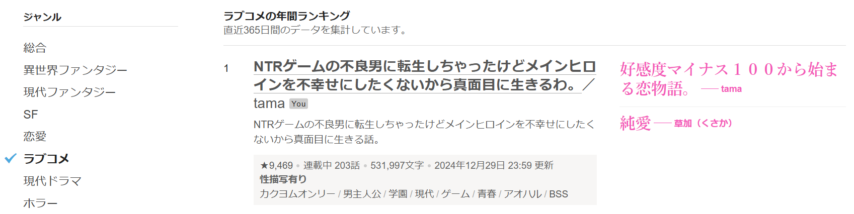 なんとカクヨムのラブコメ年間ランキングにて『NTR不良男』が一位になっていました。