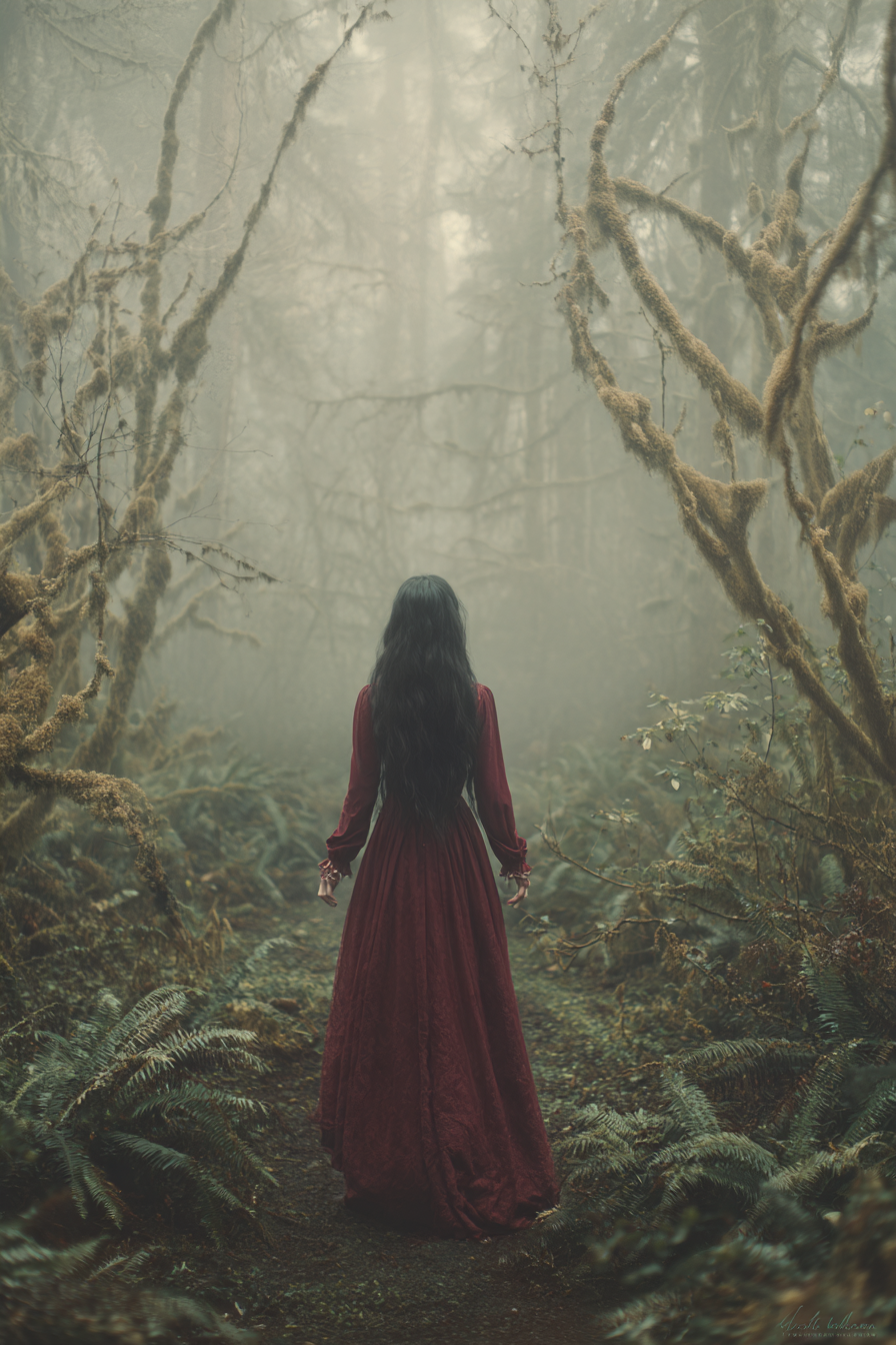 またこの霧雨とじとじとした羊歯の感じが作品の雰囲気を的確に表現していますねー。黒い長髪も臙脂のドレスもいい。