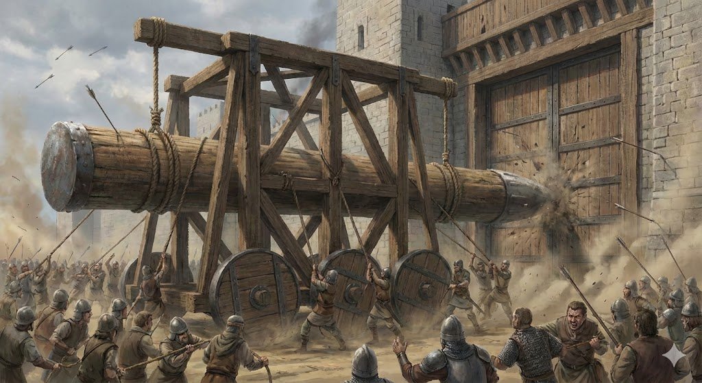 なお、この「第2話 虎穴」に出てくる攻城兵器「衝角(しょうかく)」のイメージ画像が下記になります。「字で書くだけじゃ、読者様には全然分かんないよな」と思い、ジェミニ先生(無料版)に小説を読んで貰って「このイメージで衝角を描いて下さい」と頼んだら、ものの10秒で作ってくれました。いや、まさにこのとおりですが、ほんとにこんなのタダで貰っていいんでしょうか。。右下の素手で応戦してるおじさんがまたなんとも味がありますねw わざわざ城内から一人出てくるとは、とんでもないファイターですw