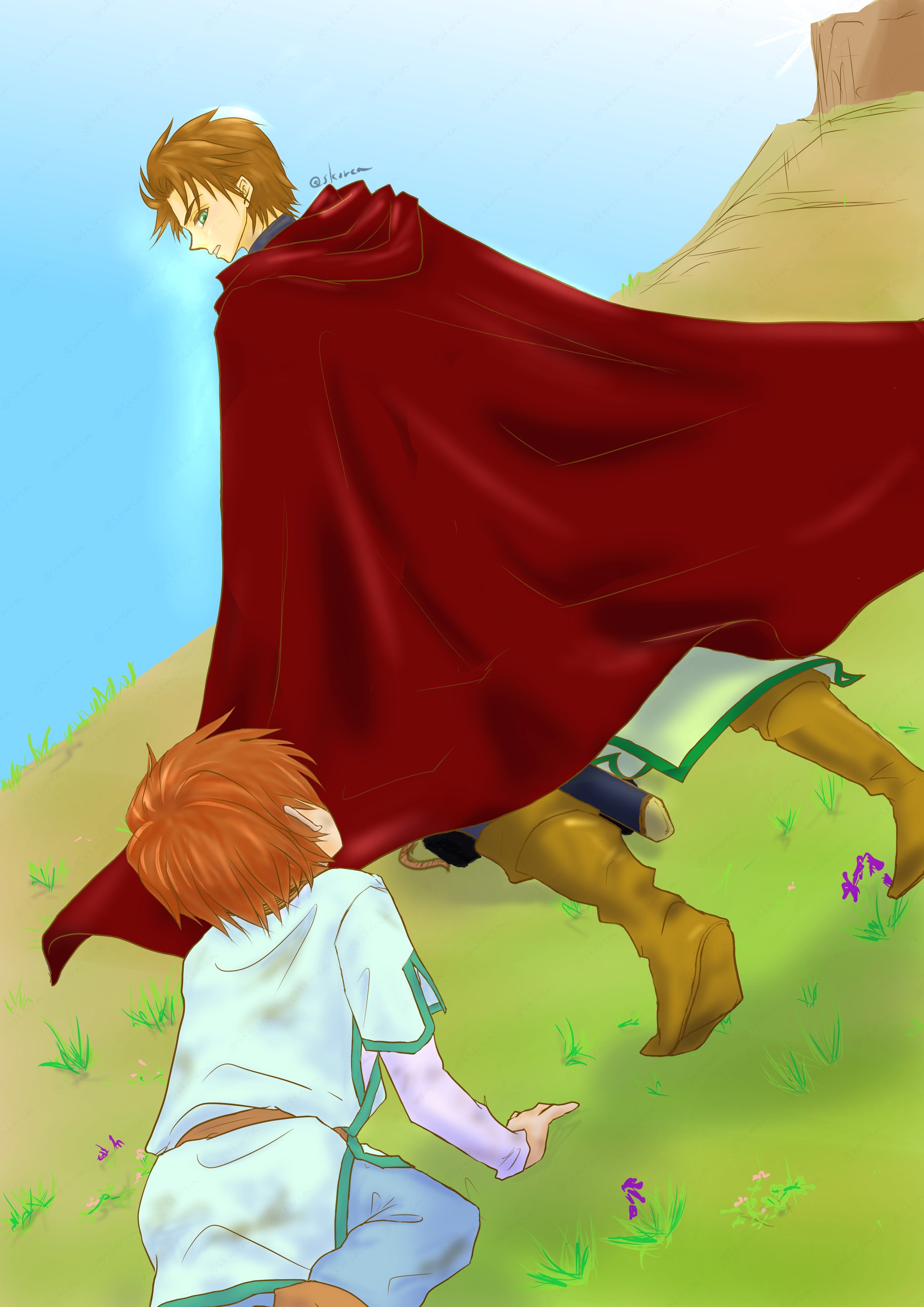 34章をお読みいただいた方にはこちらの騎士(正確には騎士見習い)の素性も明かされていますが、彼は主人公のヴィーより少しだけ若い14歳。手前のディルは8歳で、この作品を書き始めるにあたり、自分の娘よりちょっと歳上という設定にしよう……と年齢を定めたのですが、その娘が今やこの若者の方に年齢が近いのです。