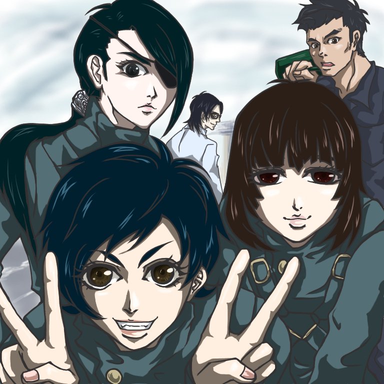 「空に描く軌跡」の空理果、黒慧、茉魚、紅緒、後ろに小さく時雨です。