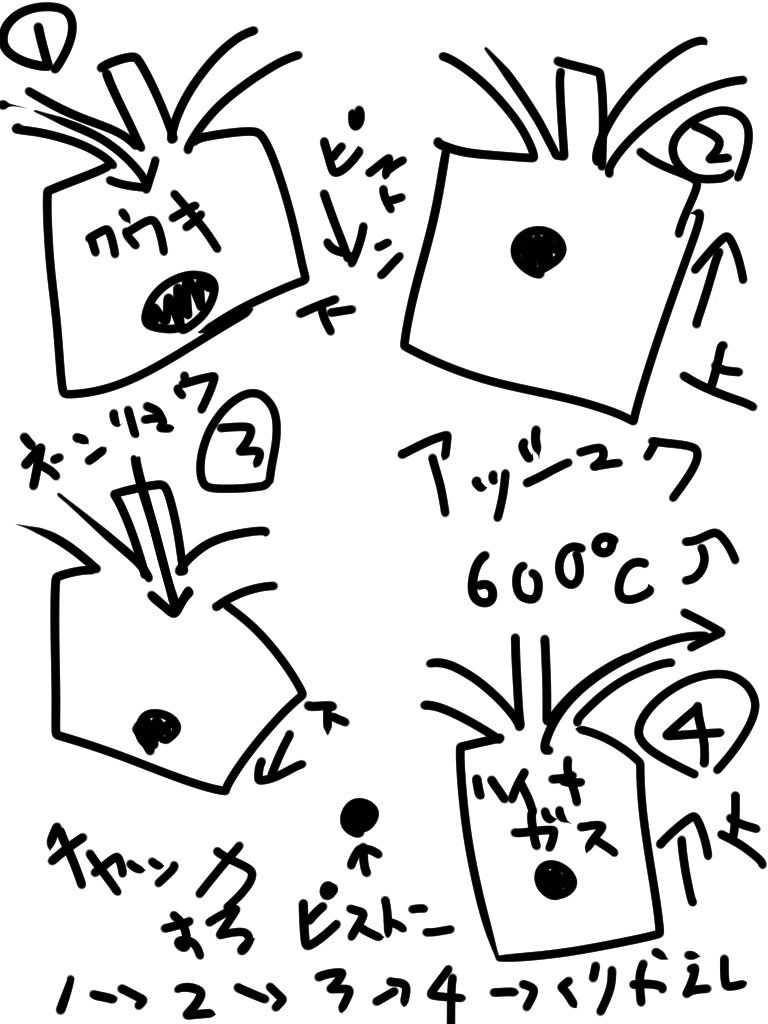 次の圧縮工程は、下に下がっていたピストンが上がって空気が圧縮される。これがまた熱そうで六〇〇度とかになる。ひええ、熱そう。熱いどころじゃないっ!