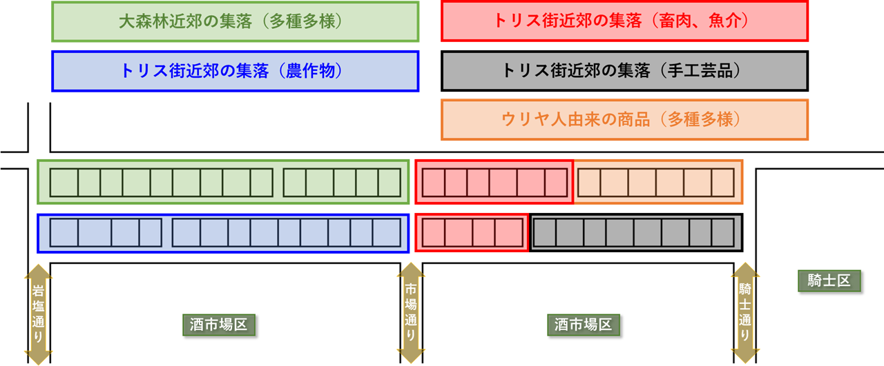 市場の管理運営は商業ギルドとトリス街政庁が共同出資して設立した市場ギルドが行う。