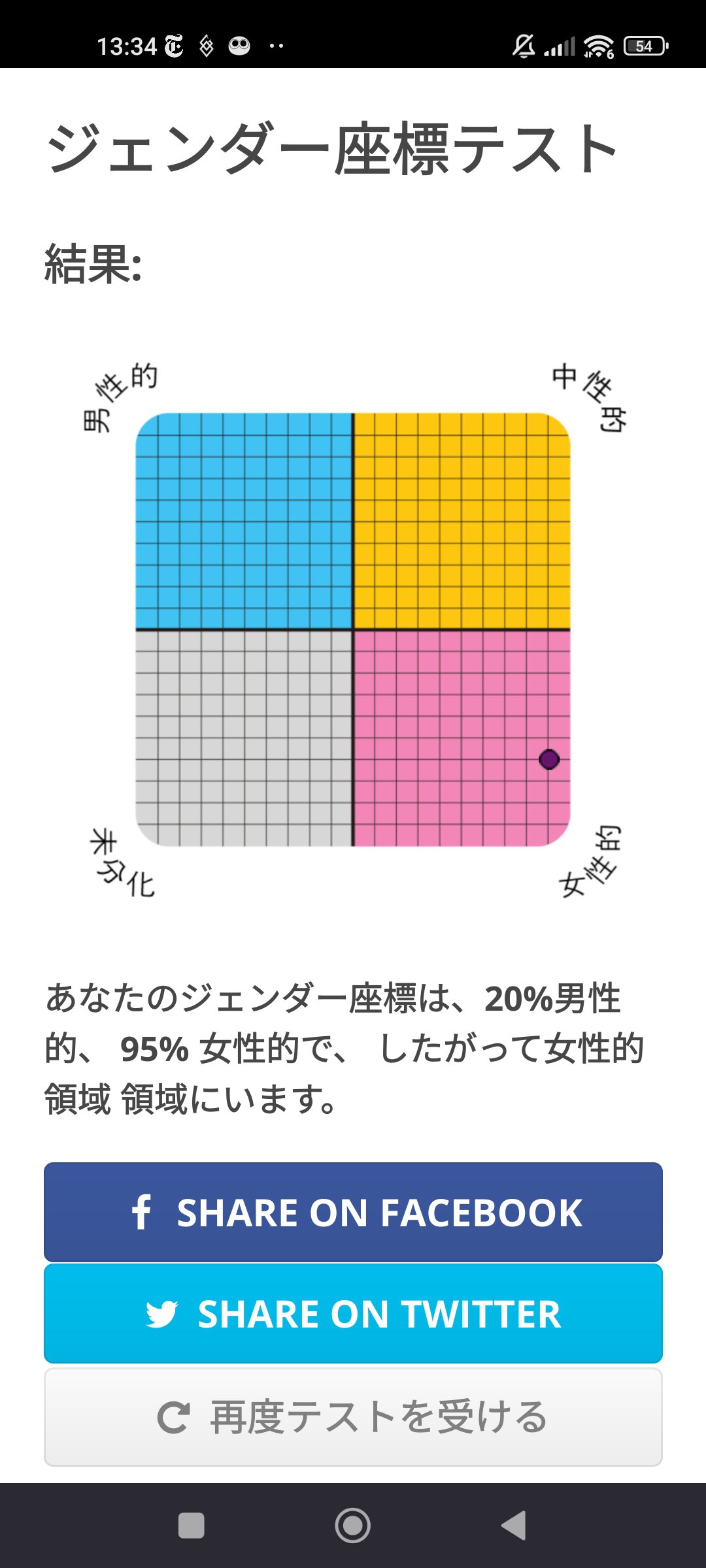 どうしようもなかった出来事、と思っていました。ただの偶然で、勘違い。しかし、今日のツイッターのトレンド「女性的領域」を見て、ジェンダー座標テストを受けたら、僕は気づきました。