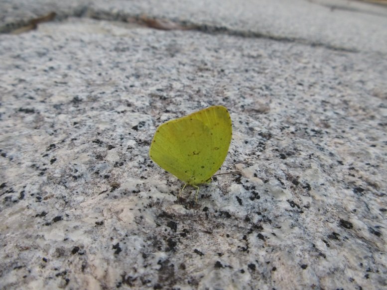 神社の石畳の上にとまって、じっと動かない蝶々を見つけました。
