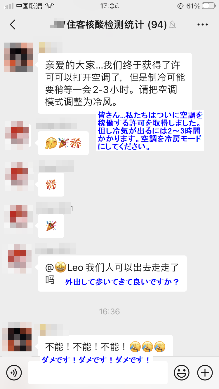 空調を使えるようになった際のホテルのグループチャットです。