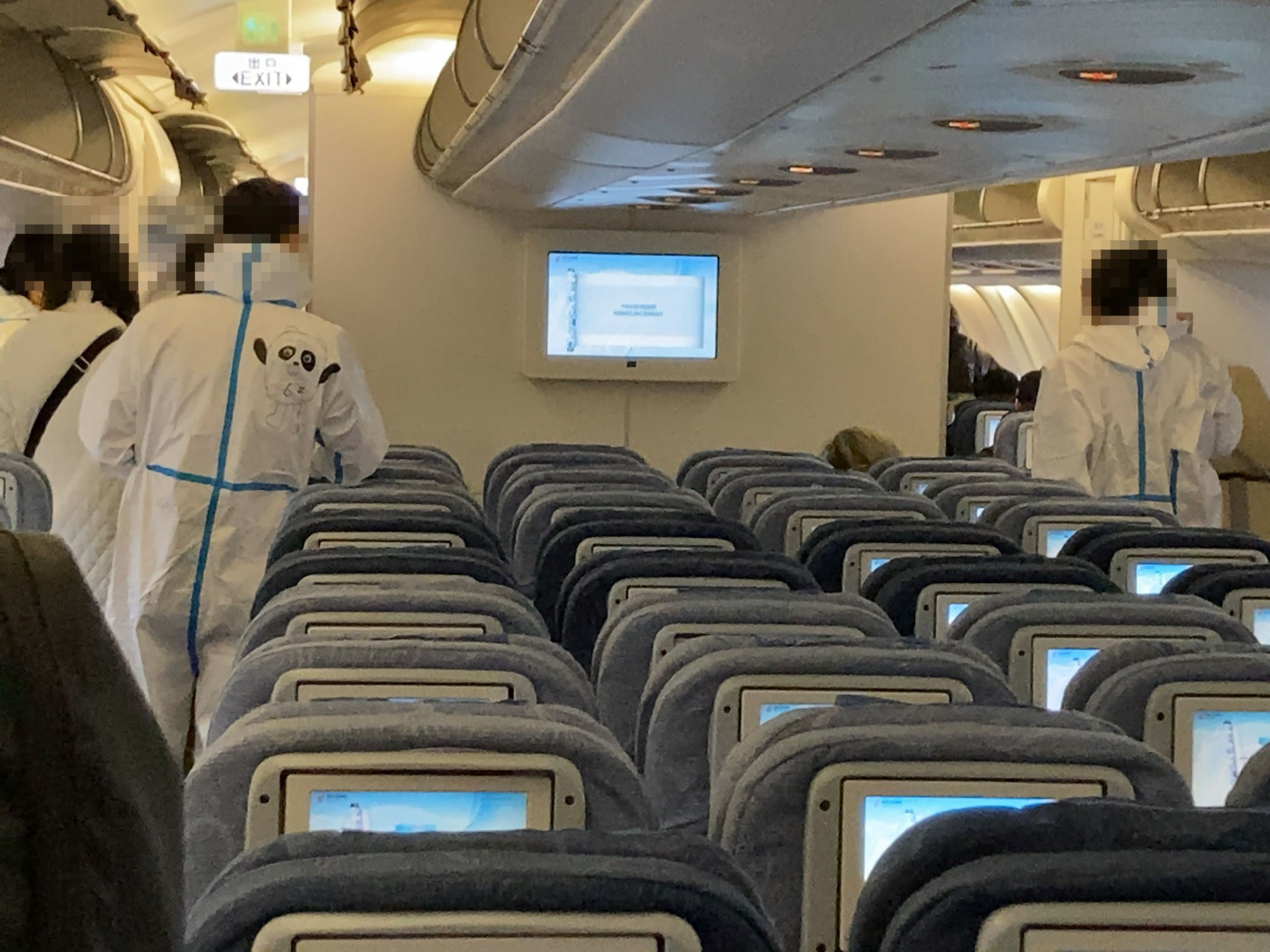 当時、日中間のフライトではフライトアテンダントもこんな防護服を着ていました。