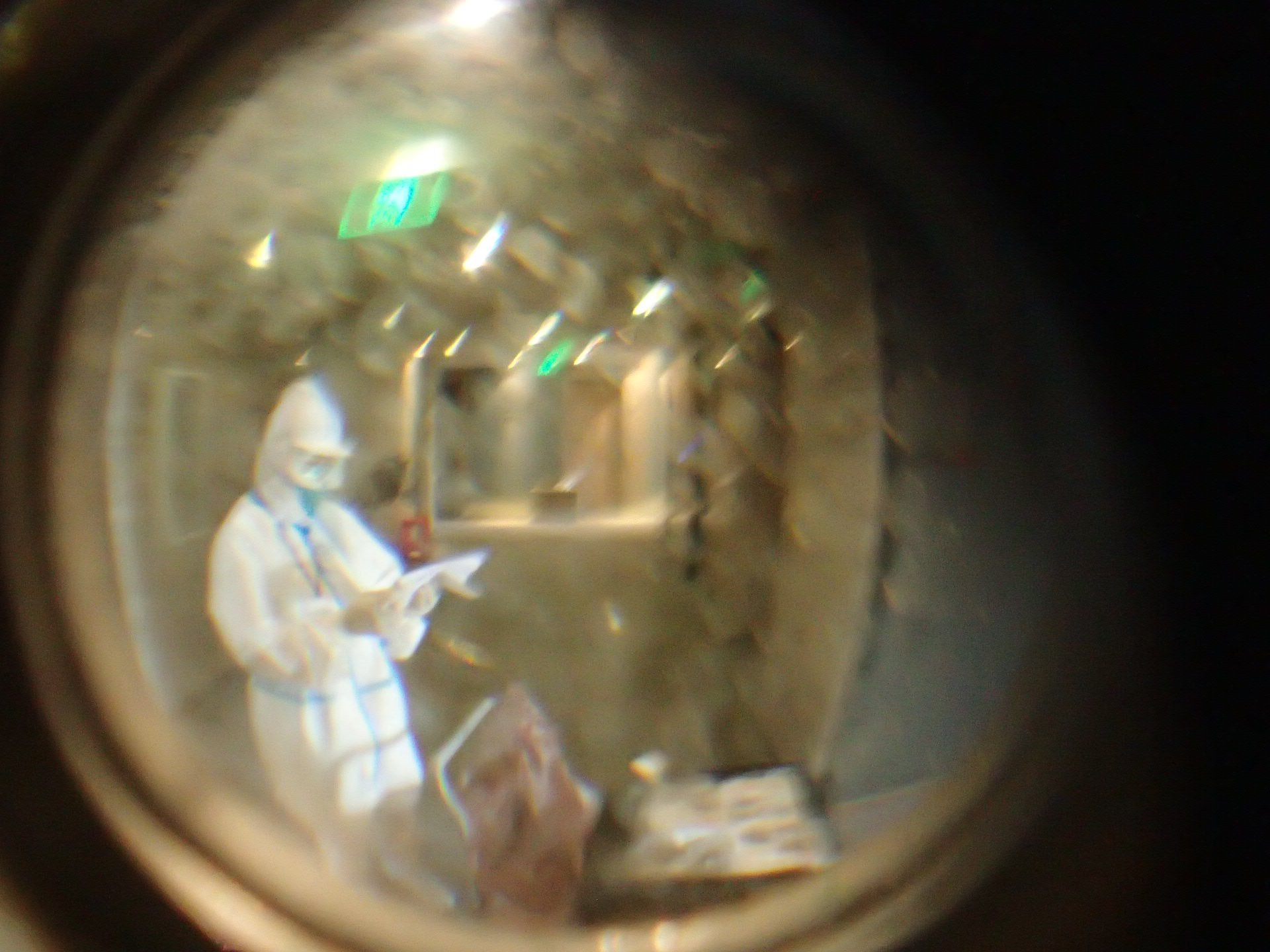 最後の画像は、隔離ホテルのドア穴から見た、防護服を着てお弁当を配るスタッフの様子です。
