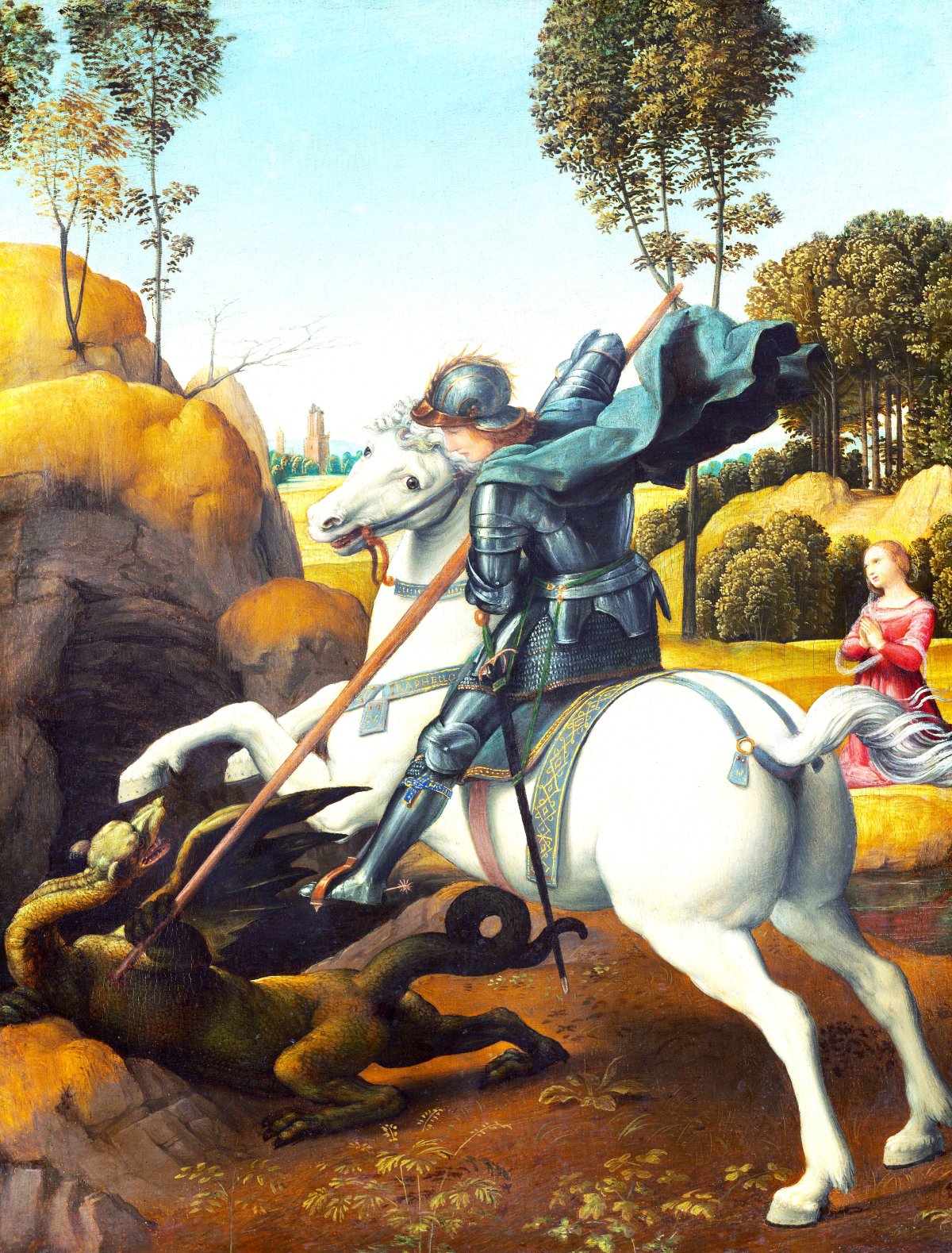 神話の中でも特に政策を支援する効果が高かった、一神教神話のイメージです。 パブリックドメインQ(ラファエロ『聖ゲオルギウスとドラゴン』)をお借りしました。
