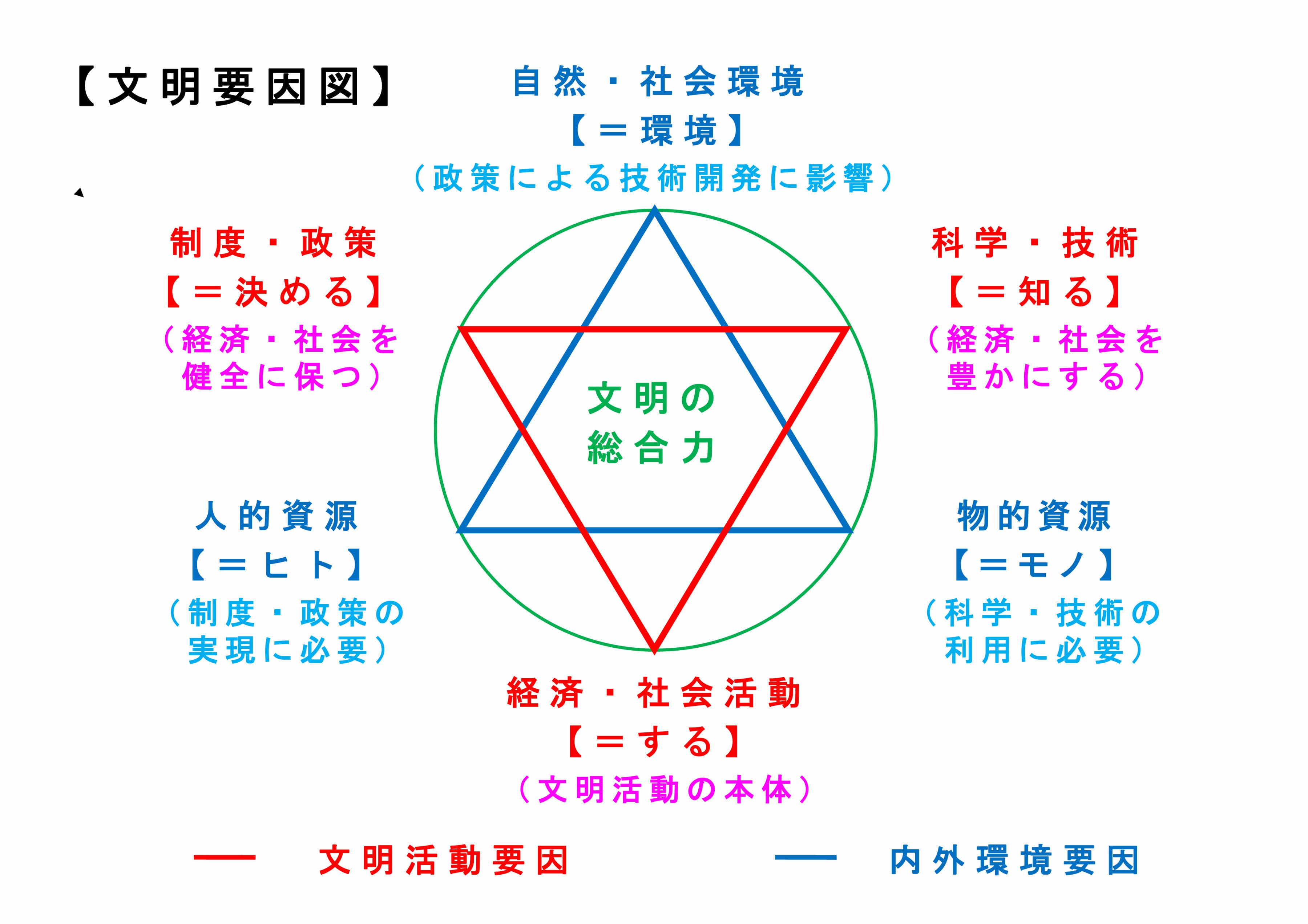 私的文明論〝文明の星〟理論の解説図です。 〝知る・する・決める、ヒト・モノ・環境〟という六つの〝文明の要素(エレメンツ)〟で文明を説明するものです。