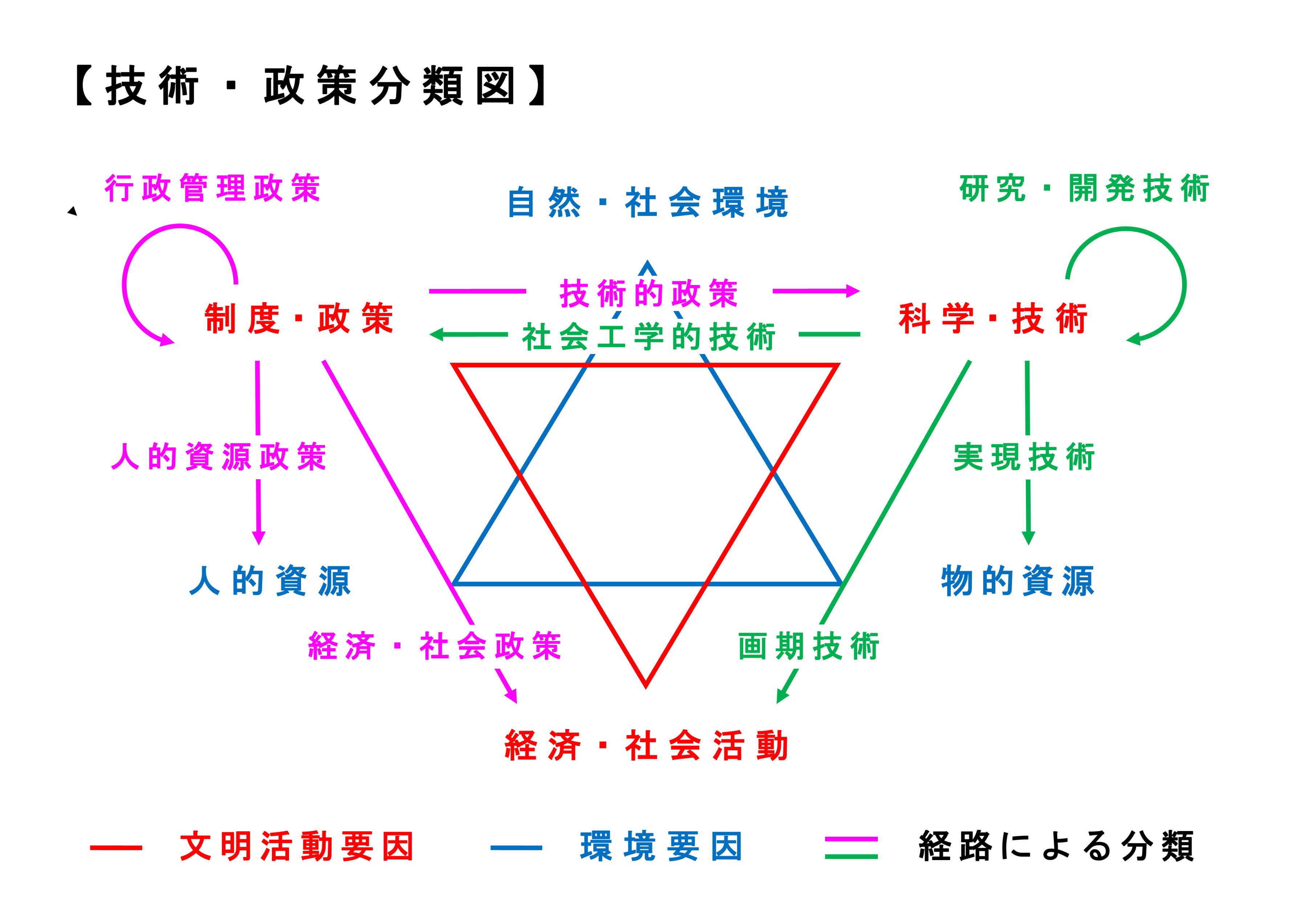 文明活動の本体として全ての人々が営む経済・社会活動を、文明の両輪である技術と政策が、4つずつの経路(ルート)を通じて助けるという、〝文明の体系(システム)〟を示した図です。