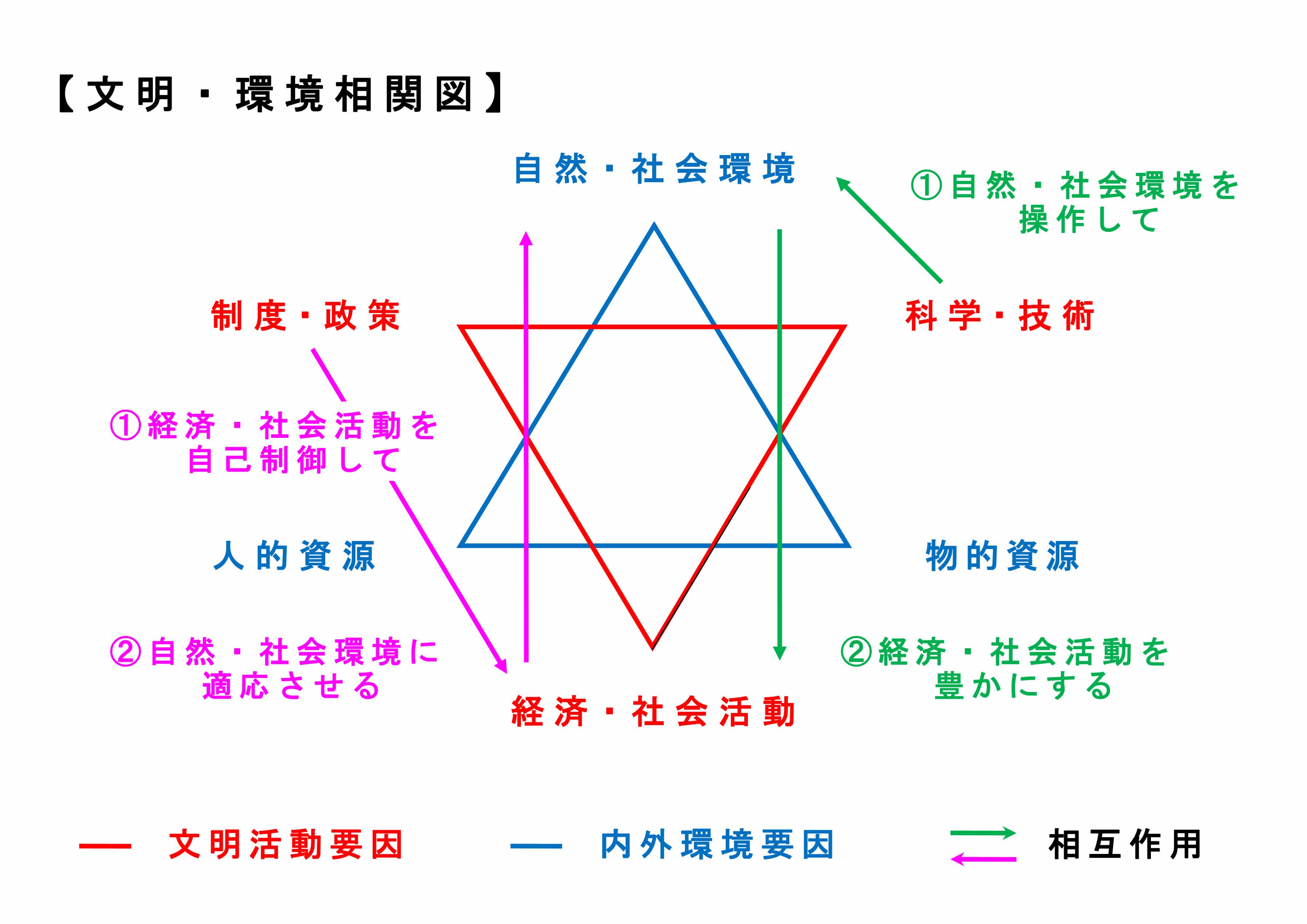 環境と生物の相互作用という生物学的視点から見ると、人間は文明活動を通じて環境と働き合います。 社会を健全に発展させるため自然・社会環境に働きかけるのが技術、変化した環境に適応し、さらなる発展のために行う社会の自己制御が政策といえます。