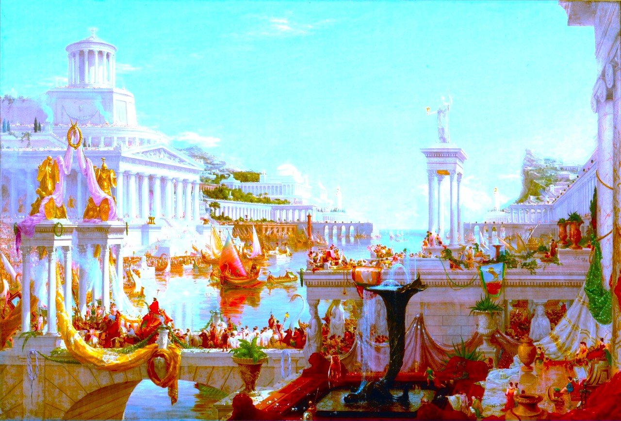 主人公が異星人から、文明について説明を求められた場面のイメージです。 ウィキメディア・コモンズ(トマス・コール『帝国の完成』)からお借りしました。 (この連作の主題は文明の栄枯盛衰ですが、小説の主題はそうした興亡の代償を低減することによる、持続的発展の確保です。)