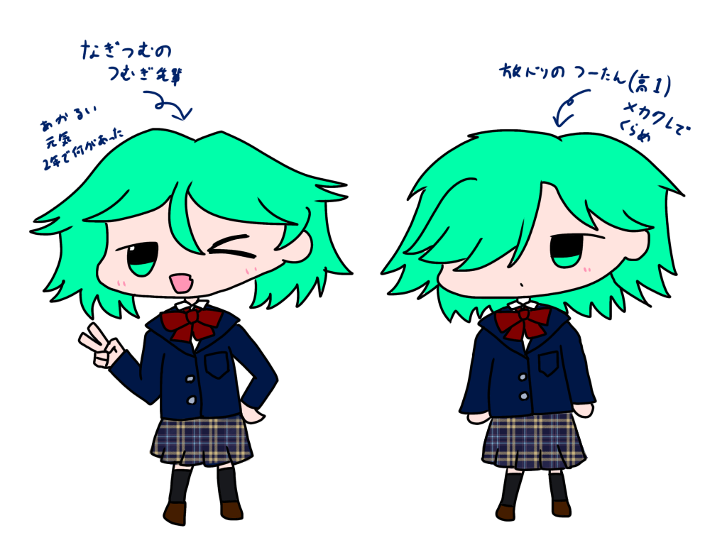 そういえば、授業中に放ドリバージョンのつむぎ先輩こと“つーたん”のキャラデザを描いてみたりしてたので、なぎつむ版との比較です。ついでに学校の制服デザイン(仮)の初公開でもある。良いですよね、メカクレ系。ナギちゃんより根暗じゃんね。