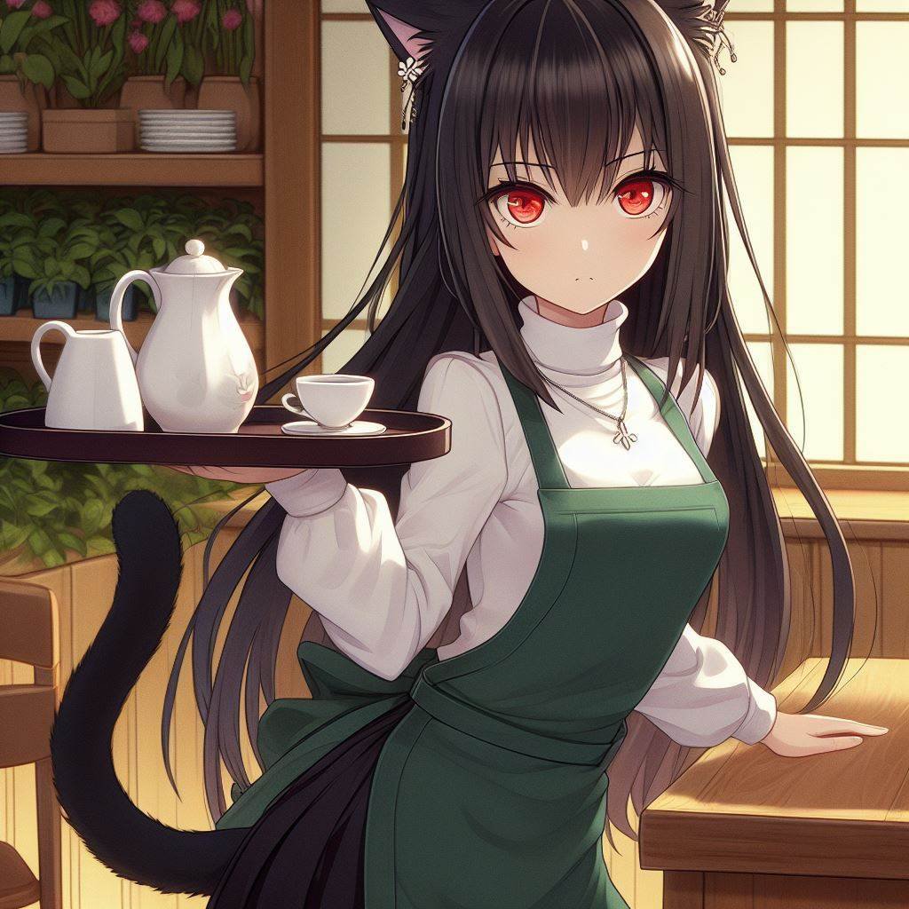 ((masterpiece, top quality), intricate details, thin, (slim)). Solo woman. Work in a coffee shop. Red eyes (slit double eyelids), black hair (long straight). Put on black cat ears. Black cat's tail. Wearing a green apron, a white turtleneck, a black and long skirt. Put a coffee cup and saucer on the tray. Anime cartoons. Kyoto Animation.