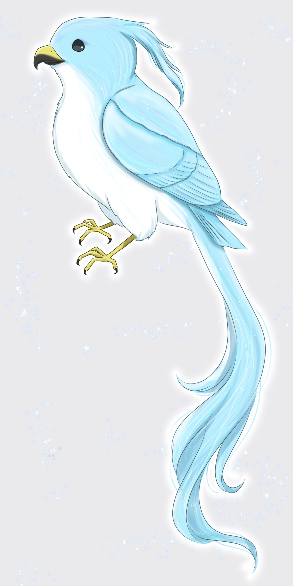 【特 徴】青白く発光していて、冠羽と長い尾羽がある。目は黒い。