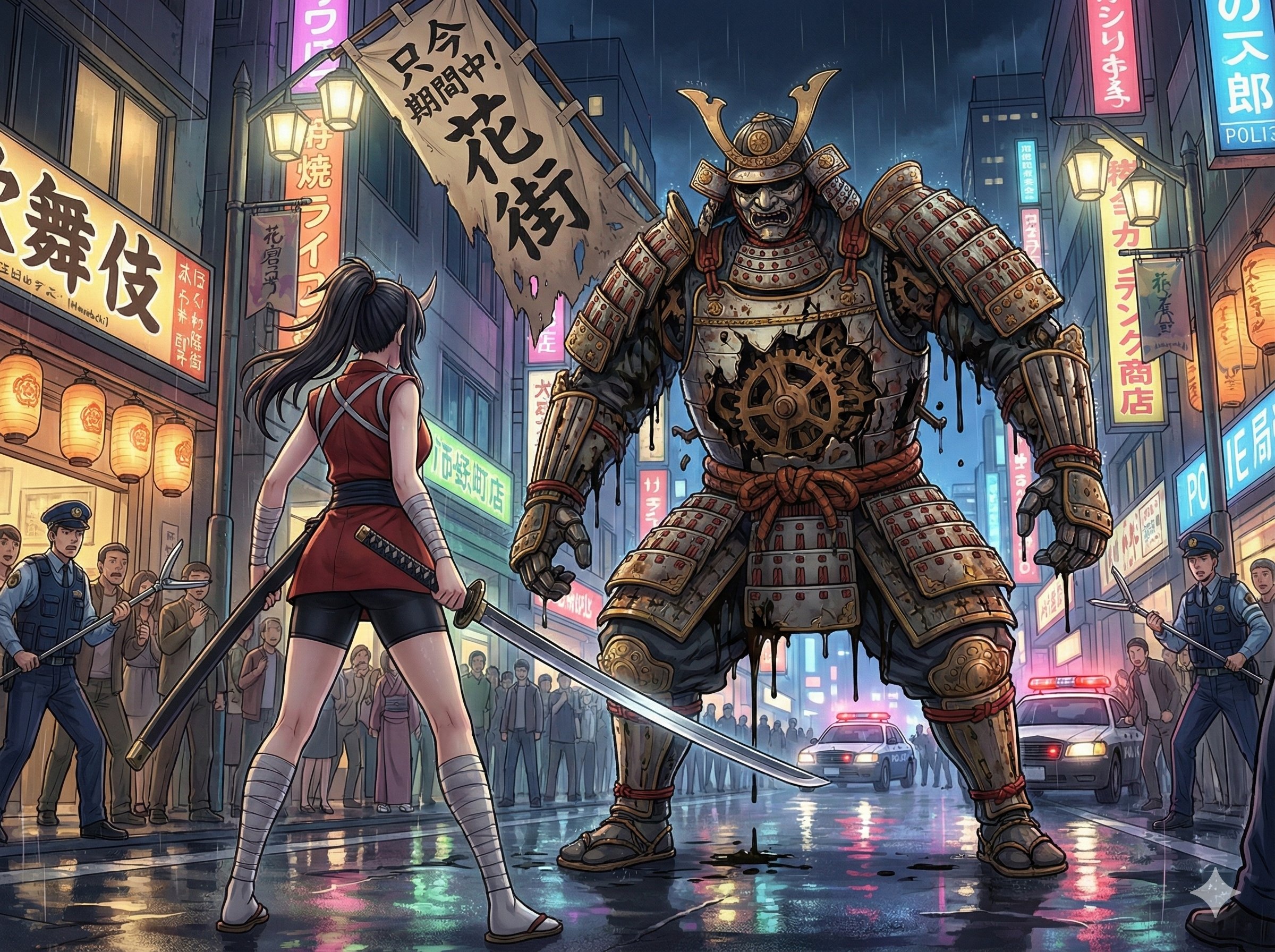 鎧武者はそのゴツイ容姿からは想像できない若い女性の甲高い声で、何度も意味不明な言葉を繰り返しています!