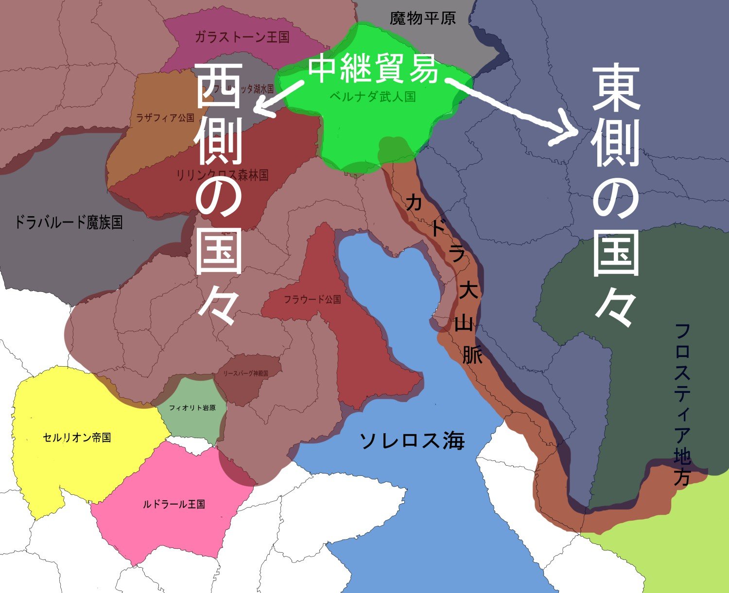 そして左の赤い部分が『西側の国々』です。ベルナダを中心としたとき西に位置しているからです。ラザフィア、リリンクロス、ファルネッタ、ガラストーンなどもこの西側諸国に含まれます。