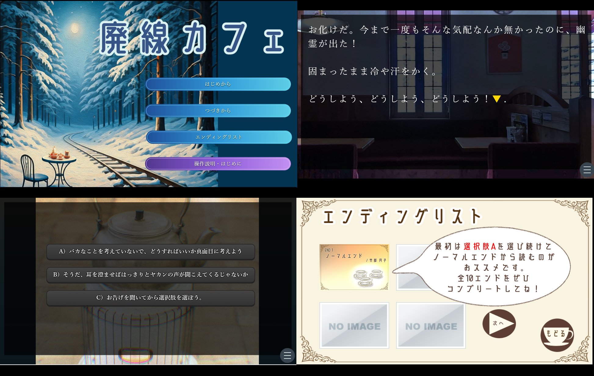 ということで、長くなりましたが、サウンドノベルゲーム「廃線カフェ」の宣伝でした。