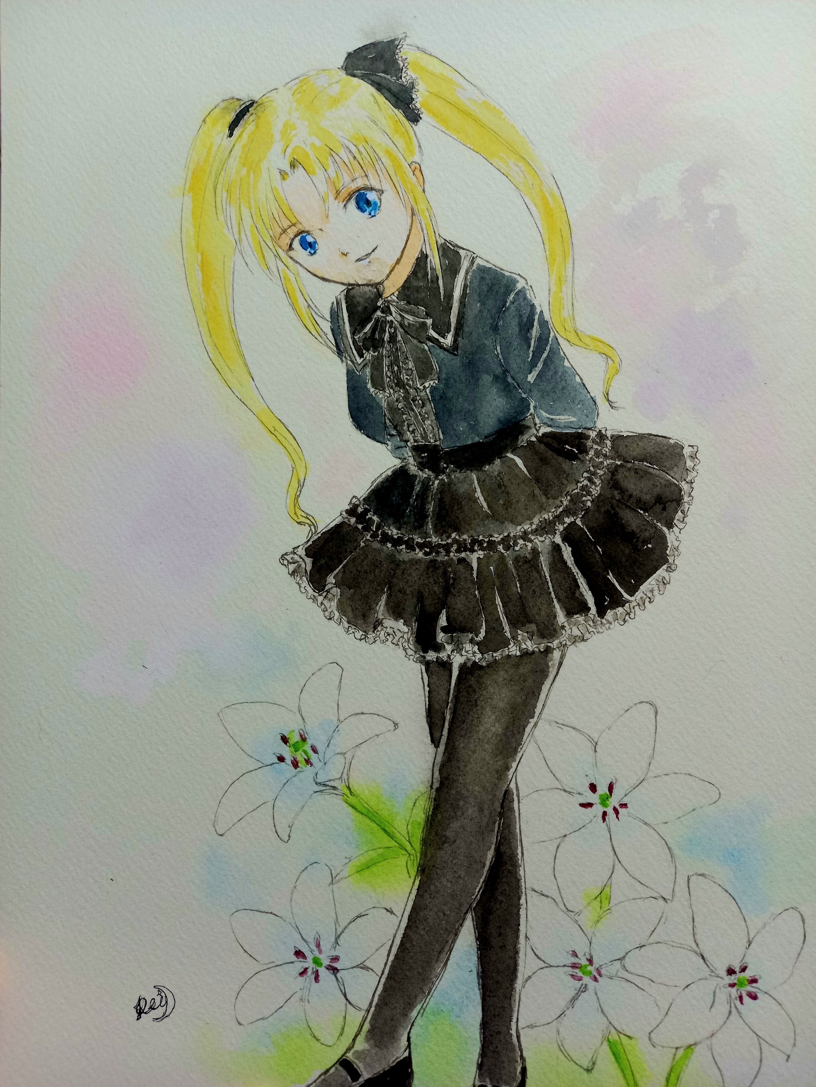これ、物語のなかで、主人公の男の子が、黒基調のゴスロリ戦闘服の子が戦う姿に見蕩れていて、私もあんなふうに黒くなったら好きになってもらえるかな? って感じで黒い服に着替えた結果がこうなった……っていう場面なんです。