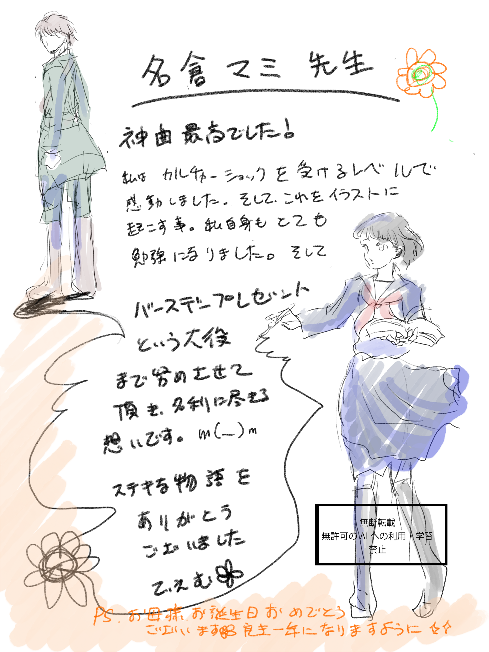 わかります?少女のペンの先から書き出される線が「彼」の歩んできた道筋になって、「彼」の足元の影に繋がっているんですよ。