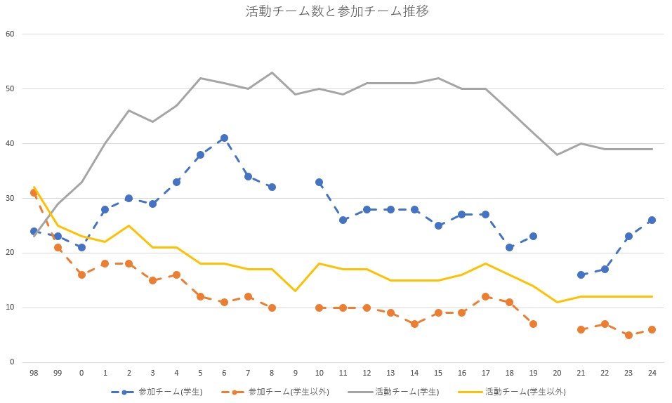 参加チーム数推移と推定活動チーム数推移を比較してみました。基本的には参加チーム数より多くなるので当然の結果ではありますが、やはり参加できないチームの数はだいぶ多い事が分かります。