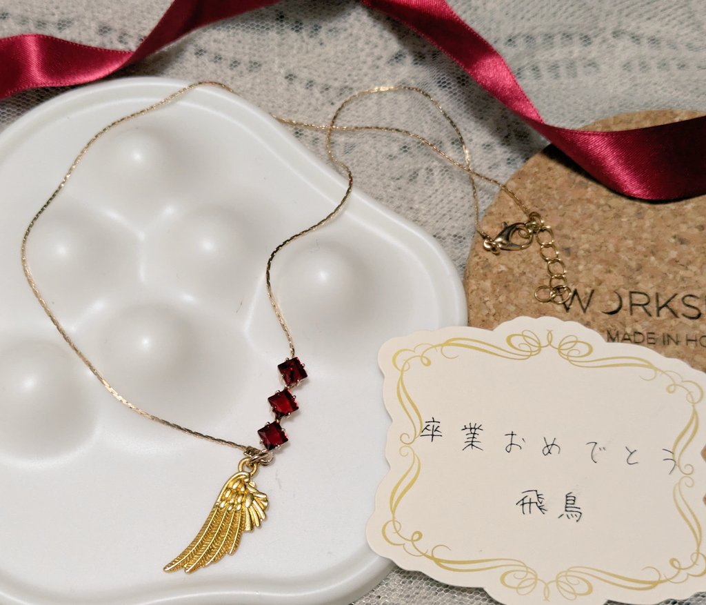 飛鳥ちゃんの名前をイメージした翼のチャームをメインに🪽赤い3連ストーンをチェーンに仕込みアシメントリーなデザインにしてみました💎
