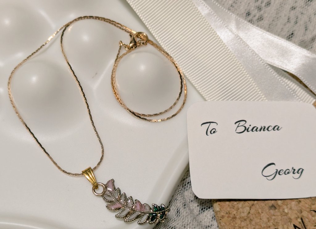 ペンダントトップは花言葉が「あなたは私の安らぎ」「いつも幸せ」であるルピナスの花をイメージ