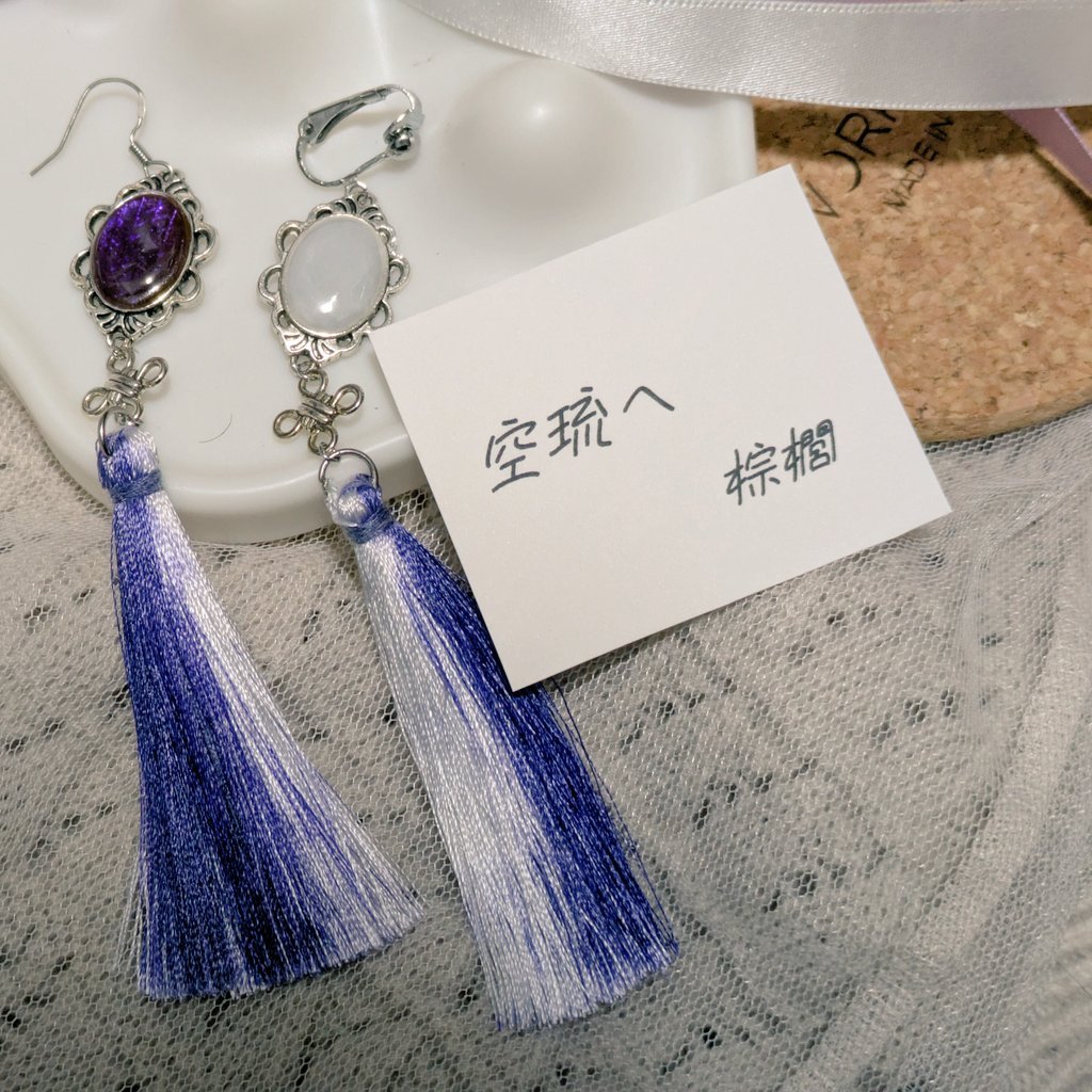 ひらひらっとした衣装に負けないよう、インパクトの残るゴシック調のデザインに。お互いのイメージカラーのレジンを流し込んだシルバーのトップパーツにバイカラーのタッセルを合わせてみました!