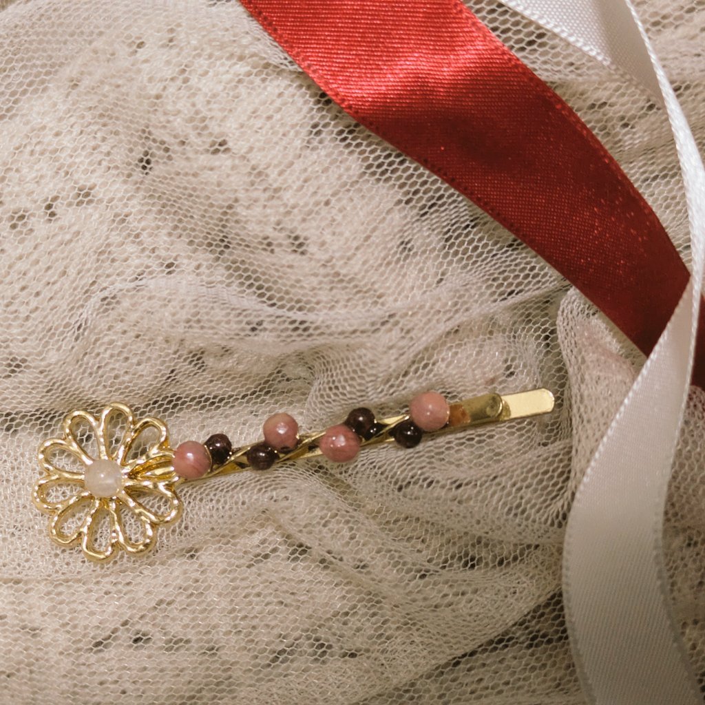 留め具部分には真摯な愛を表すにふさわしいガーネットとインカローズ、花の土台の上には御影石にも用いられるラルビカイトを添えてみました!