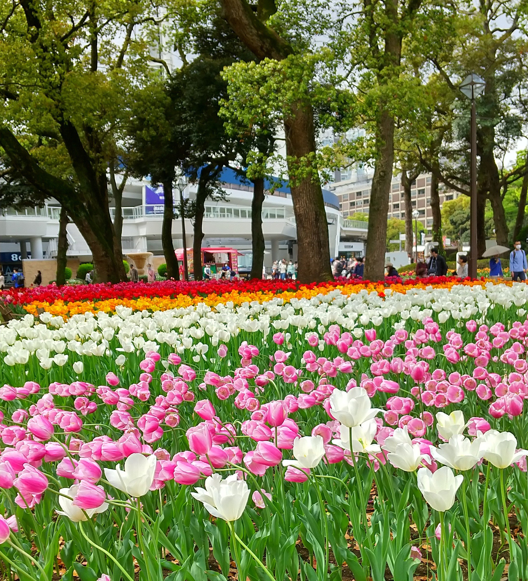 横浜スタジアムの周辺でチューリップが咲き乱れていますー。
