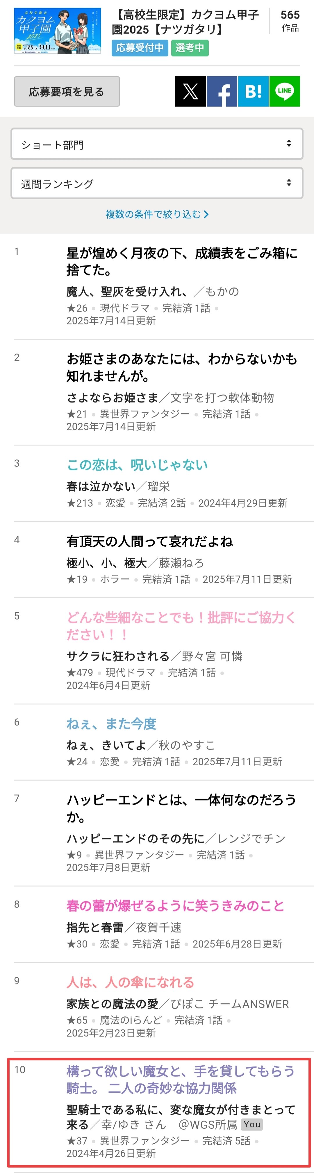 ということで、本日ショート部門のそれを確認してみたのですが……何と『10位』!!