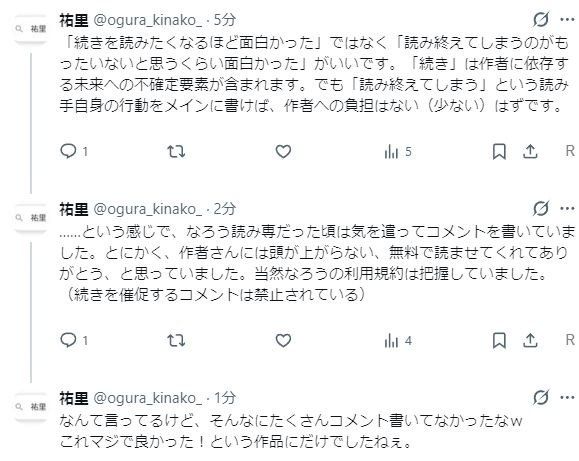 TLに流れてきた、『「続きを読みたくなるくらい面白かった」というコメントは作者の負担になることもあるから、「面白かったです!」「とても好きです!」みたいな言い方に変える方がいいよ☆』みたいな内容のポストについての発言だったのです。