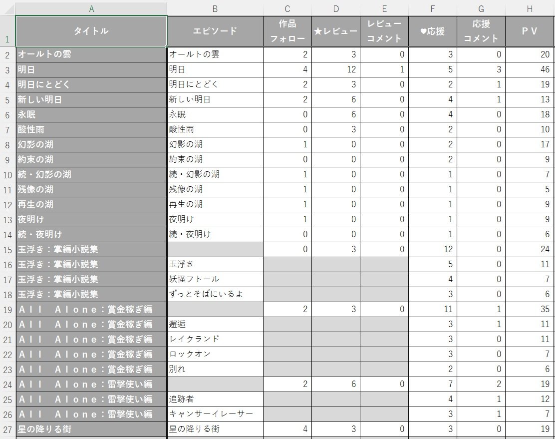 貼付した図はカクヨムで公開している Kindle 本収録作品への現時点での評価データです。拙作をお読みになる際のご参考になれば幸いです。