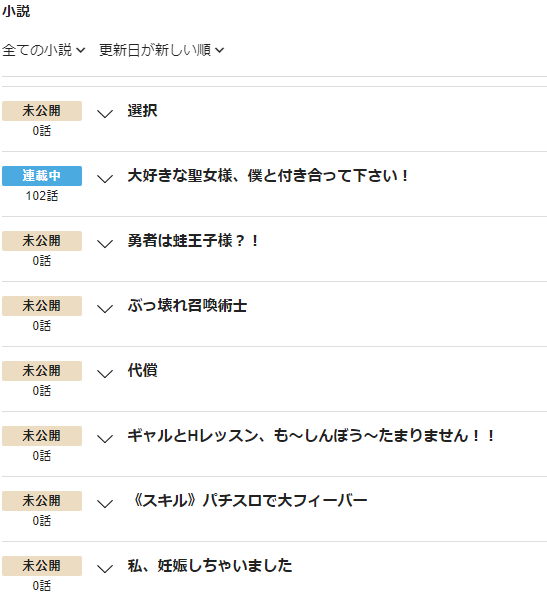 現在未公開の分だけでこれだけあり、まだいくつかの作品を消しており、未公開の分も2~3話ほど書いて筆が止まっている状態です。