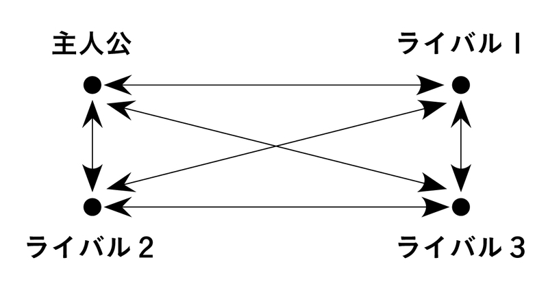 2:各キャラクター同士をそれぞれ対立させる(主人公とだけでなく、ライバル同士もお互いに対立させる)こと。