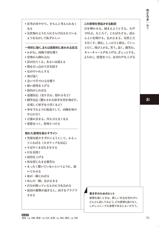 知識として、5つの表現手段があること、そしてそれらの表現にはどのような特徴があるのかを把握することは重要ですが、そんなに難しいことを考えなくてもすぐに使えてしまうのが本辞典の大きな特徴です。作者は表現したい感情の項目を引き、そこに書かれている「外的なシグナル」や「精神的な反応」などの具体例を参考にしながら執筆すればよいのです。その手軽さと実用性が本シリーズの最大のウリとなっています。